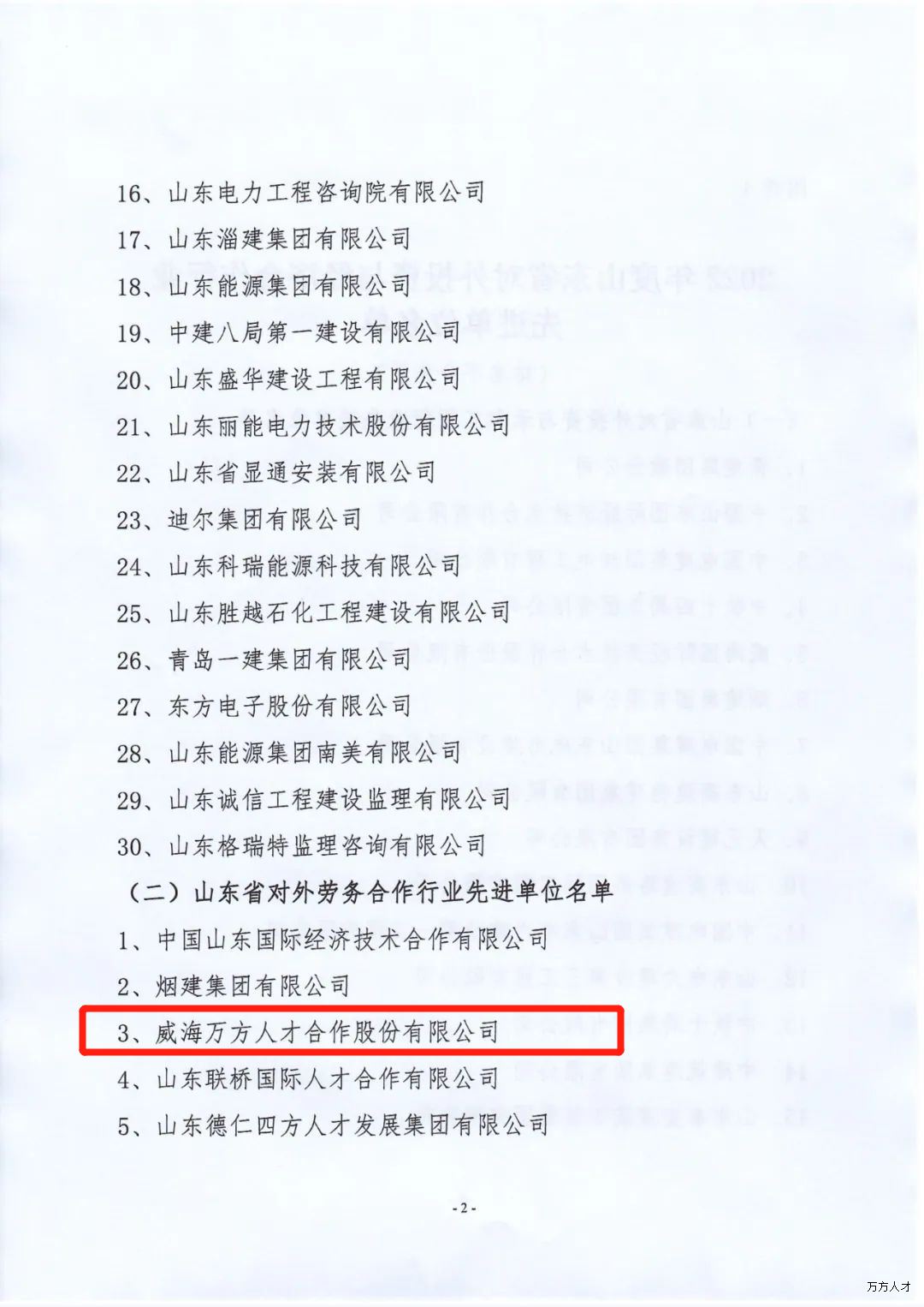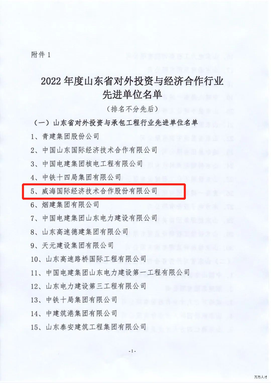 2月13日山東省對外投資與經濟合作商會公布了《2022年度對外投資與經濟合作行業先進單位》的評選結果,“威海萬方人才合作股份有限公司”成功入選!